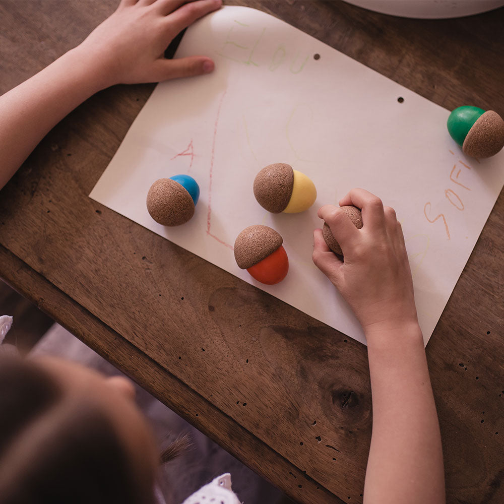 Få timevis af fantasifuld leg med vores økologiske farveblyanter, som er specielt designet til små hænder. Vores agernformede farveblyanter er lavet af naturligt korkmateriale og kommer i en praktisk bomuldspose. Giver dit barn en sjov og kreativ oplevelse!
